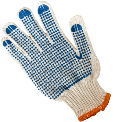 Характеристики • Тип: рукавички робочі, трикотажні • Матеріал: 60% бавовна, 40% поліестер • Колір: білий • Довжина: 250 мм • Щільність: 330 • Кількість ниток: 6 ниток • Покриття: ПВХ крапка на долоні • Клас в’язання: 7