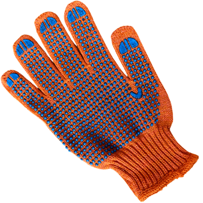 Характеристики • Тип: рукавички робочі, трикотажні • Матеріал: 60% бавовна, 40% поліестер • Колір: помаранчевий • Довжина: 250 мм • Щільність: 330 • Кількість ниток: 6 ниток • Покриття: ПВХ крапка на долоні • Клас в’язання: 7