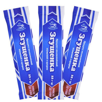 Згущене молоко, в стіках по 22г, 25шт/уп, ТМ Смакуйте Згущене молоко ТМ "Смакуйте" в зручному форматі стіків — це справжній комфорт і насолода для любителів солодкого. Витончений смак згущеного молока, знайомий ще з дитинства, тепер у порційній упаковці, яка ідеально підходить для швидкого використання в будь-яких умовах. Стіки забезпечують оптимальну кількість продукту для однієї порції кави, чаю, десерту або іншої страви, зберігаючи свіжість і чистоту. Формат стіків стає незамінним у кафе, барах, ресторанах, а також у подорожах, на пікніках і навіть в офісі. Вони вирішують проблему незручності при використанні традиційних банок зі згущеним молоком, дозволяючи насолоджуватися улюбленим продуктом швидко й акуратно. Згущене молоко ТМ "Смакуйте" — це не лише ласощі, а й відмінна альтернатива цукру й звичайному молоку, яка додає особливу ніжність і насиченість каві, чаю або випічці.