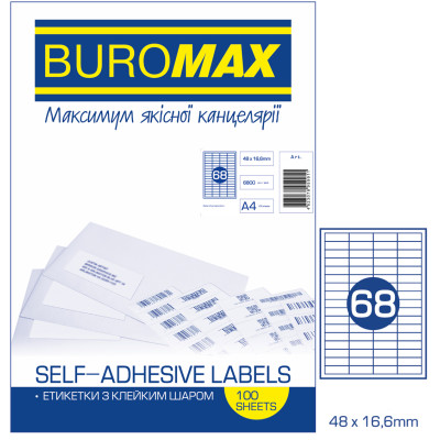 Етикетки клейкі, 68шт/А4, 48х16.6мм, 100арк/уп, TM Buromax